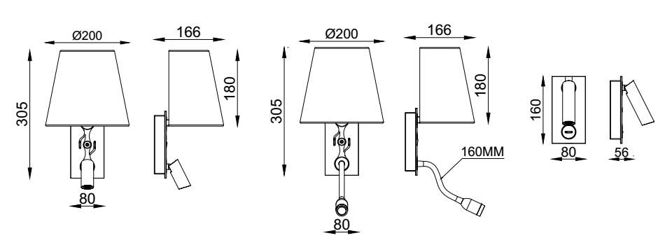ITEM NO VA1130-2W Dimensions 200x305x166MM | 80x160x56MM electrical E27 | E27 + LED COB 3000K CRI>80 Power E27 MAX 60W | E27 MAX 60W + LED 3W Material Aluminum + Iron Shade Black Fabric | White Fabric Color Black | White